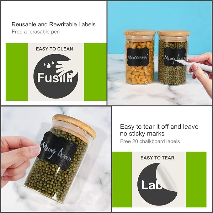 - Value Pack: 15 pack 8 oz/ 240 ml glass storage containers with airtight bamboo lids, water-resistant labels and chalkboard pen