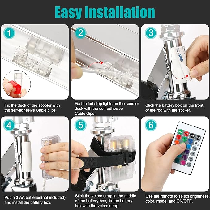 - 【Easy to Install】 The Flexible strip light allows you to bend or shape freely, just fix the led strap lights on the scooter deck with the self-adhesive Cable clip, and fix the battery case with the velcro strap,no need to worry about the lights or battery case falls down while tossing.