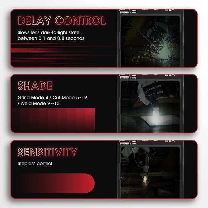 - Fast Auto-darkening: This auto darkening welding helmet features 4 Arc Sensors for reliable arc detection, ultra-fast switching (1/30000 sec), and adjustable Sensitivity and Delay controls for perfect performance