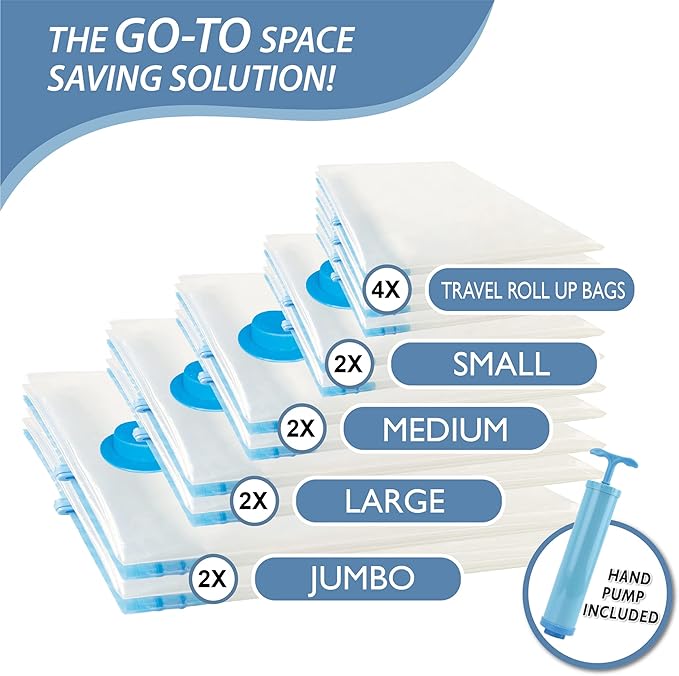 - 12 Pack Includes: 2 Jumbo: 39.35 X 27.5in(100cm X 70cm); 2 Large: 33.5 X 21.65in(85cm X 55cm); 2 Medium: 27.5 X 19.5in(70cm X 50cm); 2 Small: 23.5 X 15.7in (60cm X 40cm); 4 Travel Roll Up (No need vacuum holes): 23.5 X 15.7in (60cm X 40cm)