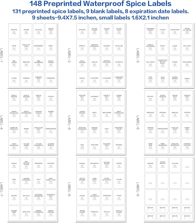 - 【MINIMALIST-WATERPROOF SPICE LABELS】Our glass spice jar labels include 131 preprinted spice labels, 9 blank labels, 8 expiration date labels. These spice stickers are high contrast for easy reading. Vinyl labels are preprinted on water resistant white matte backing that won't peel off or tear, can be removed and replaced. Perfect fit 10oz spice organizer jars.