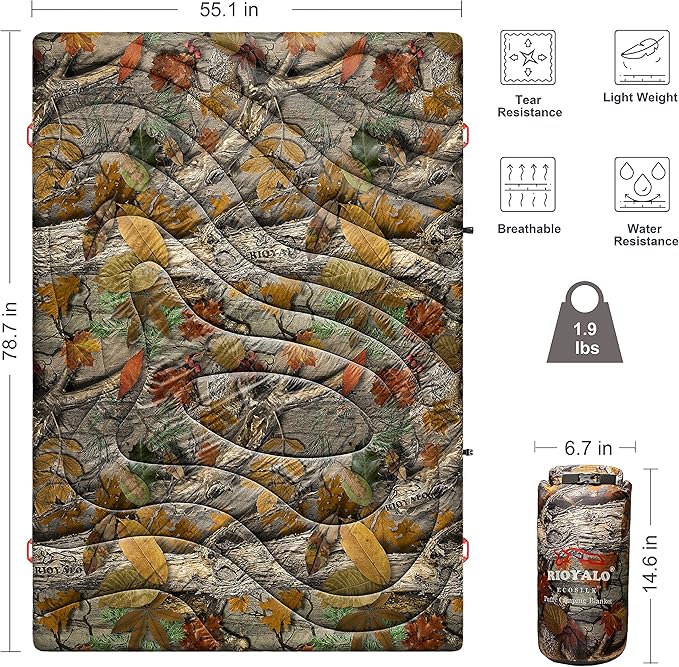 ECOSILK Outdoor Blanket Waterproof | XL Puffy Camping Blanket for Hiking Backpacking | Lightweight Packable Travel Cars Blanket w. Stuff Sack for Picnic Festival |55 X 79 in| Forest Camo…