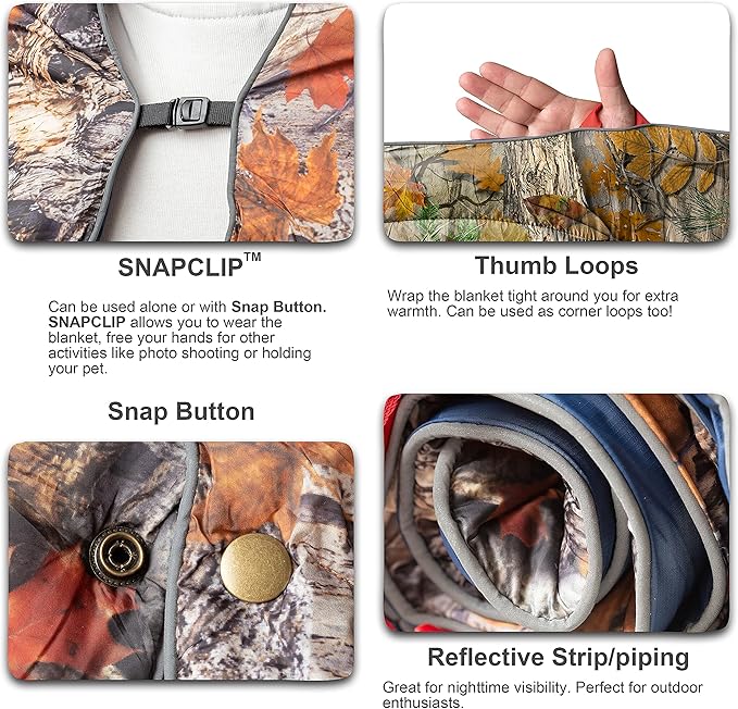 - 🎯 WEARABLE LIKE PONCHO LINER 🎯 The distinguished SNAPCLIP allows you to wear the blanket like a woobie, free your hands for other activities like photo shooting, preparing food, holding your pet while staying warm. The Snap Button is a surplus and more convenient.