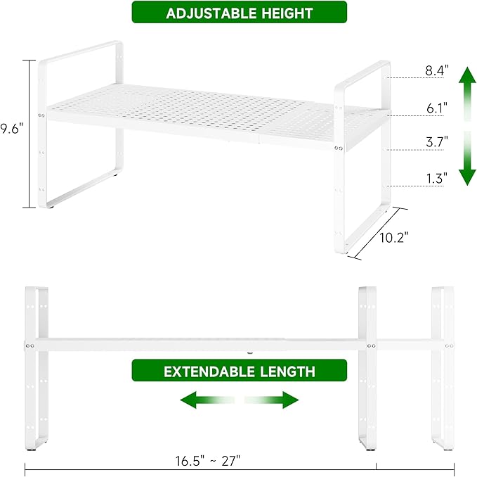 - EXTANDABLE KITCHEN COUNTERTOP ORGANIZER : This is a very flexible countertop organizer rack, and its height and length can be adjusted according to your needs. The size before expansion is 16.5 "L x 10.2" W x 9.6" H, the length of the shelf organizer can be stretched from 16.5 inches to 27 inches.