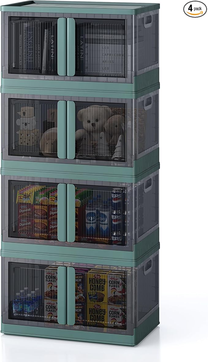 19Gal Collapsible Storage Bins with Lids & Wheels - 4 Pack Stackable with Doors, Heavy-Duty Plastic Containers for Home/Office, Green