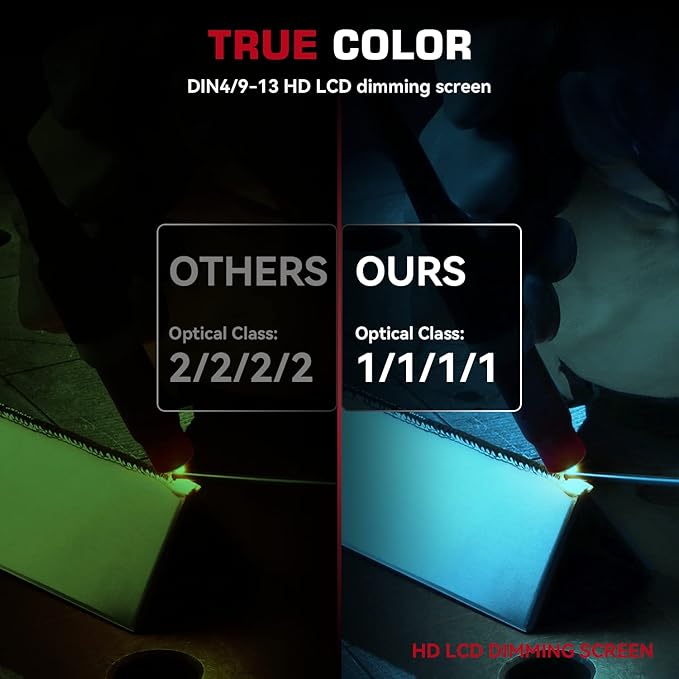 - 【FASTER AUTO-DARKENING】Features high-end auto-darkening lenses with 4 premium arc sensors, switching from light to dark in 1/25000 sec. Easily adjust the shade and sensitivity of the lenses for different working environments, perfect for TIG/MIG/ARC welding. Dark state level: 4/9-13.