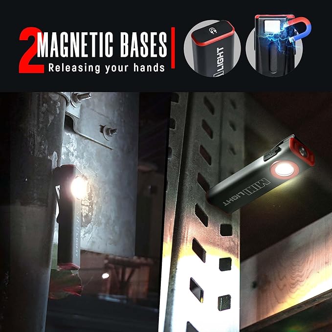 - 【Clip and Magnet Design】Our EDC Flashlight features an excellent multifunctional design. The clip of our work light allows you to securely attach it to belts, tool bags, or tent tops, releasind your hands. Additionally, our work light is equipped with 2 powerful magnets, which can firmly attach to various metal surfaces. You can easily attach the light to your car hood or steel shelf while repairing.