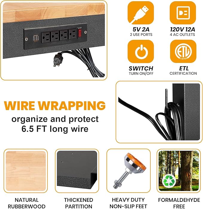 - 【Power Strip】We fitted a power outlet for the work benches for garage.Convenient for you to use a variety of power tools and lamps. sewing table has 4 AC Outlets and 2 USB-A ports on the power strip.