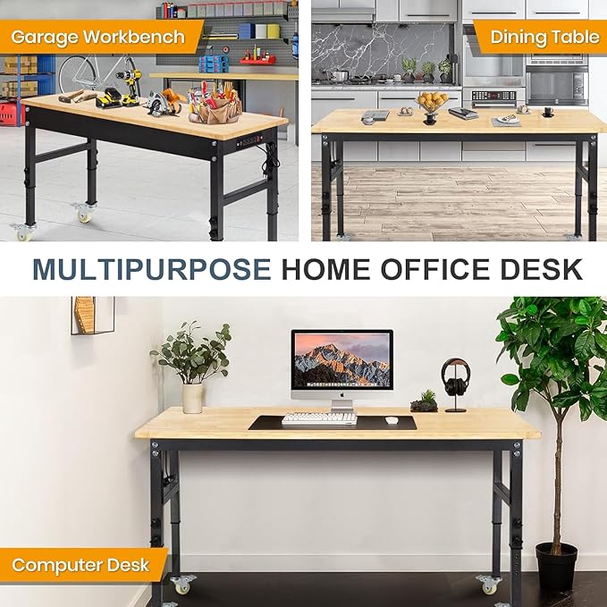 70'' Adjustable Workbench, Rubber Wood Top Work Bench Heavy-Duty Work Table with Socket, Wheels and Fixed Legs 2000 LBS Load Capacity Hardwood Sewing Table for Garage, Workshop, Home, Office