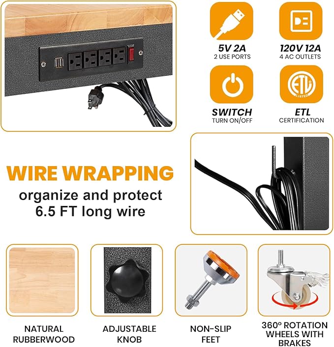 - 【Power Strip】:We fitted a power outlet for the work bench.Convenient for you to use a variety of power tools and lamps. Sewing table has 4 AC Outlets and 2 USB-A ports on the power strip