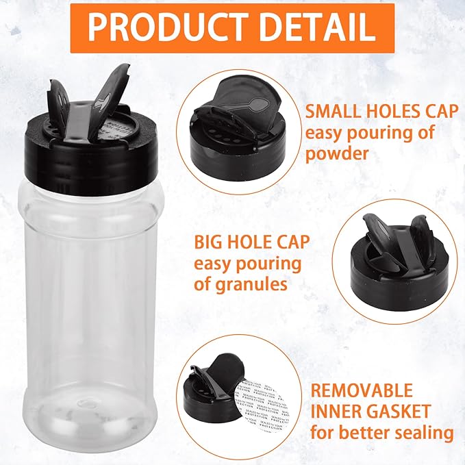 - Reasonable Design: The plastic seasoning containers are built in two-sided flip tops for shaking or pouring different spices. Each empty spice bottle contains removable sealing paper under the lid to keep the spice inside fresh