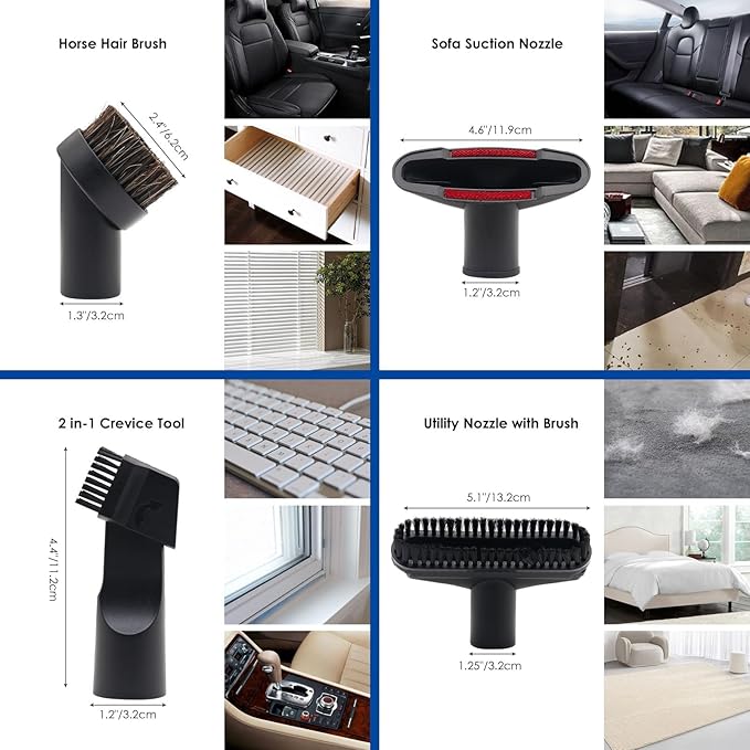 - DURABLE MATERAIL & WIDE USAGES: Crafted from premium ABS plastic and natural horsehair, these universal vacuum attachments ensure long-lasting performance. Brush attachment for shop vac are versatile and suitable for various surfaces like carpets, hardwood floors, sofas, vents, cars, and pet hair removal