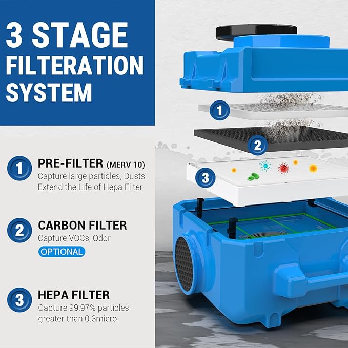 - 3pcs Air Scrubber AF500: 500cfm Hepa Air Scrubber Including 1 prefilter, 1 H13 True Hepa Filter, Dual GFCI outlet, Variable Speed Switch, Hepa Change Indicate Light
