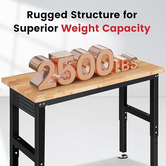 60 Inch Workbench for Garage Adjustable Height Work Bench with Pegboard Power Outlets Rubber Wood Tabletop Work Table for Cutting Wood Woodworking Shop Home Office Electronic