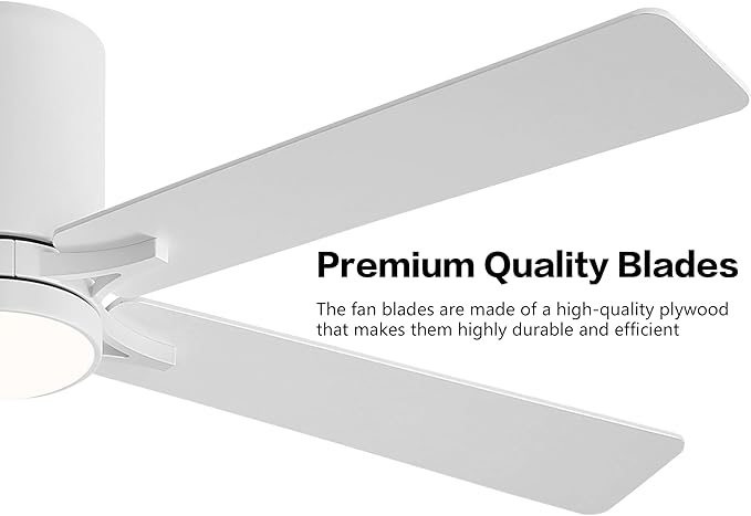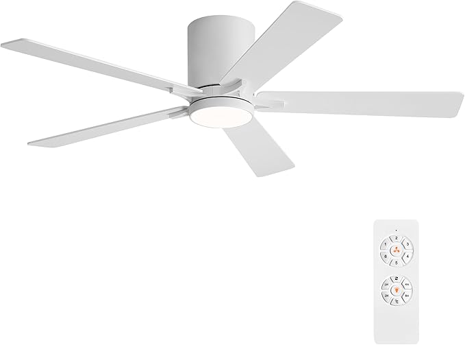 WINGBO 52" DC Flush Mount Ceiling Fan with Lights, 6-Speed Reversible DC Motor, 3CCT, Low Profile Hugger Ceiling Fan for Living Room Bedroom Kitchen, White Finish and White/Oak Blades