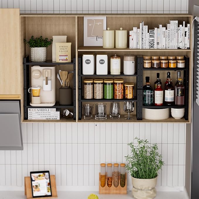 - ⭐【Versatile Spice Shelf for Cabinet】This adjustable kitchen counter stand shelf instantly create additional storage space.It is very helpful to organize the Bottles, Cans, Bowls, Plates, Pans, Soup pots in kitchen,Pantry and cupboard.Also a great space-saving option for the bedroom, study, sitting room, bathroom, and more.