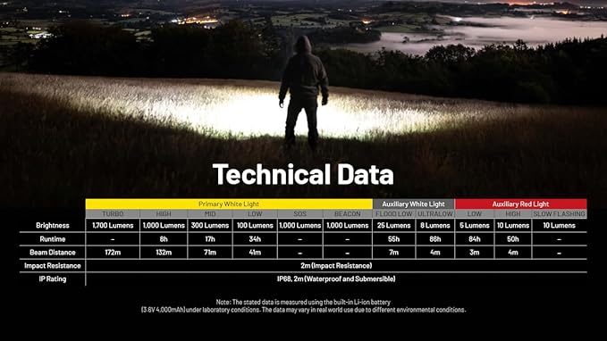 - POWERFUL HEADLAMP - The NU45 headlamp is capable of emitting 1700 lumens with a max beam distance of 188 yards, an ideal companion for various activities such as working, camping, hiking, and more