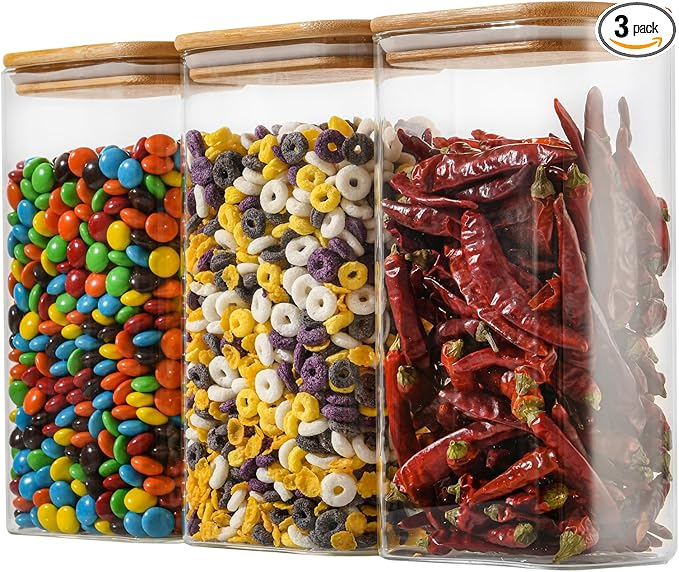 - [Better Seal with Elastic Silicone Ring] - The glass storage jar with an airtight lid uses a natural bamboo lid and an elastic silicone seal ring to create a better airtight space, extending the freshness and storage time of food. In addition to practicality, these uniquely designed jars can also serve as decorative pieces, making them perfect for housewarming and wedding gifts.