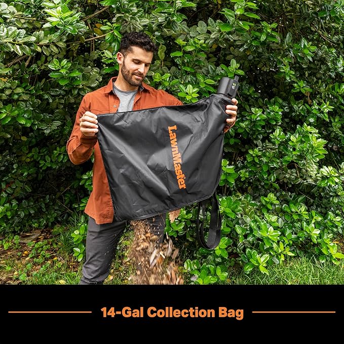 LawnMaster BV1210 Electric Blower Vacuum Mulcher 12 Amp 2-Speed Adjustment with Metal Impeller 240 MPH 380 CFM 16:1 Mulch Ratio with Collection Bag
