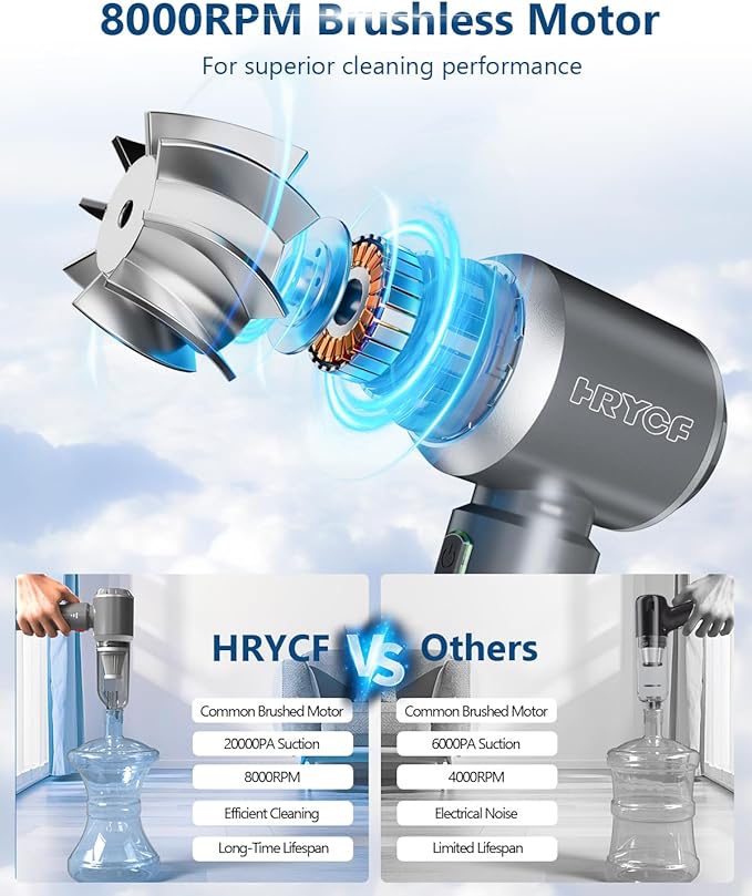 - 【Brushless Motor & 20,000Pa High Power】The rechargeable car vacuum features cutting-edge brushless motor technology, reaching up to 80,000RPM and delivering 20,000PA of suction power. Compared to traditional motors, the brushless design offers stronger suction, enhanced performance, and a longer lifespan