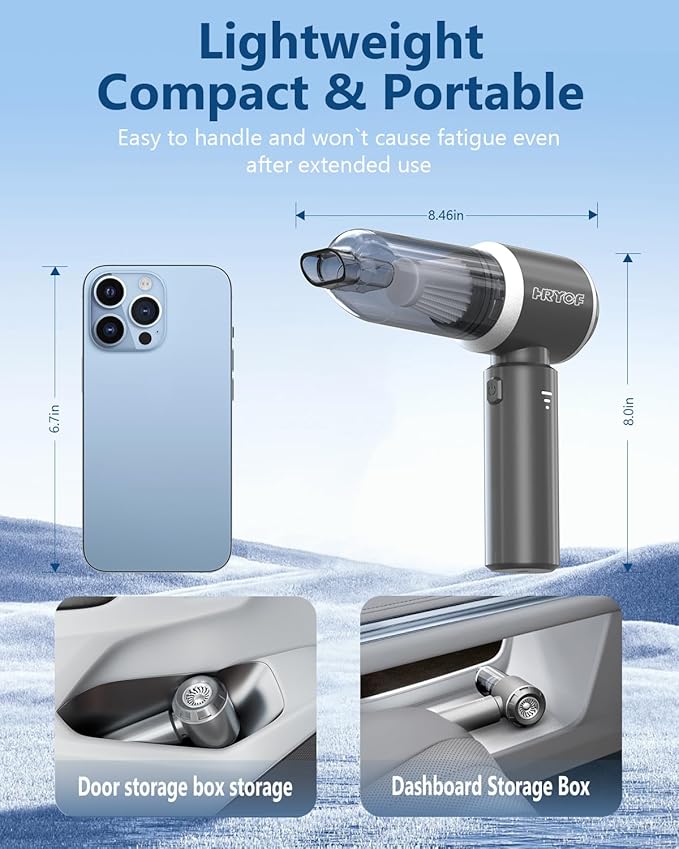 - 【Easy to Use & Long Runtime】HRYCF portable vacuum for car is user-friendly with a simple long press to power on and a single click to adjust the power level. Three power levels handle various debris types with ease. The 6000mAh battery provides up to 40 minutes of runtime, even lasting 15 minutes at the maximum 20,000PA suction setting