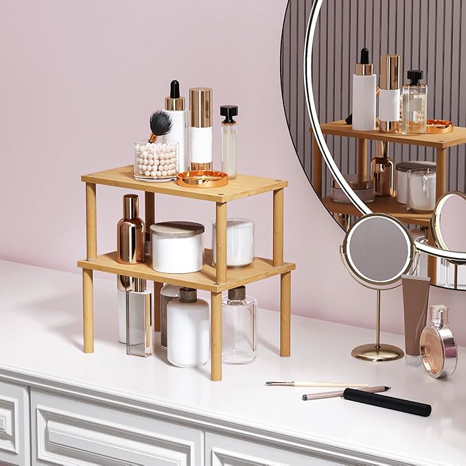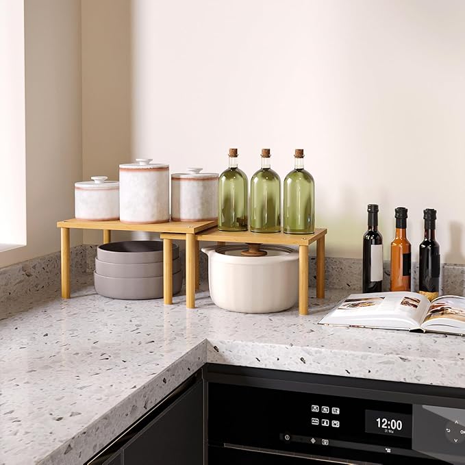 Cabinet Organizer Shelf(Set of 2),Kitchen Counter Shelves,Bamboo Stackable Expandable Spice Rack Countertop(Medium)