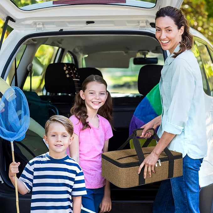 - Details: The casserole dish carrier bag adopt double zipper design, easy to open and close; The internal aluminum film not only holds heat but easy wiped clean with paper towels when encountering dirt; Note: Not machine washable