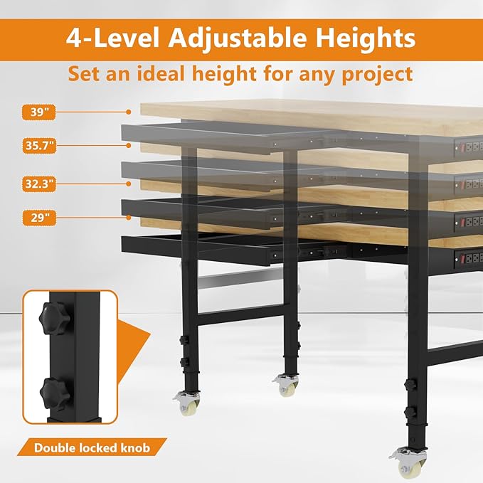 60" Work Bench with Wheels, Adjustable Height Workbench with Drawers, Heavy-Duty Work Table with Power Outlets, 2000 LBS Capacity Workstation for Garage, Workshop, Office, Home