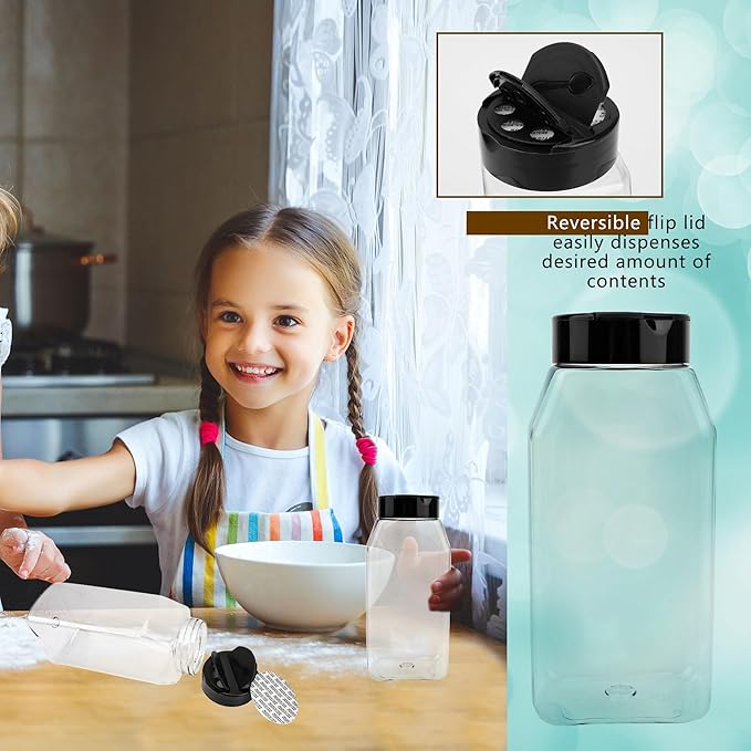 - 【Nolvety Design】: The safe plastic spice jars are designed with clear and transparent, allow you to see the inside clearly and easily identify what it is. Our large spice containers come with practical features such as a removable internal seal to ensure the freshness of the contents, the 2 sided flip tops make it easy to dispense the contents in the desired quantities. Our product is not just functional, but it's designed smartly for your convenience
