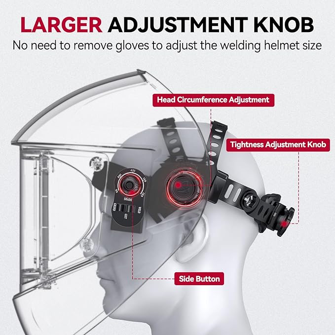 • EASIER ADJUSTMENT - The welder helmet features a newly upgraded knob section, allowing for easy adjustment even while wearing gloves. The interior of the helmet has been rearranged for a better fit to the human head, ensuring comfort even during extended wear.