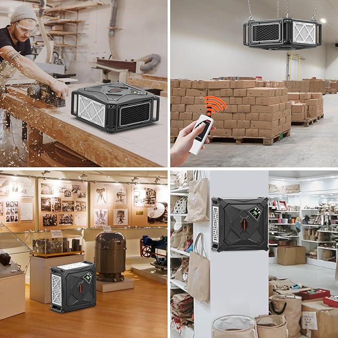 - Compact & Quiet Performance:Measuring just 18.35"L×18.35"W×8.82"H, this space-saving unit delivers whisper-quiet operation (<50dBA) while effectively purifying air in spaces up to 800 sq.ft. The optimized airflow design ensures thorough dust collection without disturbing work activities.