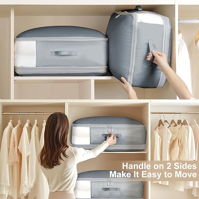 - Perfectly Size:Our organizer bag offer ample capacity without being cumbersome or space-consuming. Each bag can hold a large winter comforter or 6-8 down jackets. They are perfectly suited for decluttering your wardrobe and keeping your seasonal items organized and ready for use.Tip: After receiving your quilt storage bags, you can wash or iron the items before use to smooth out any wrinkles that may have occurred during transit. If you encounter any issues, we're more than happy to assist you
