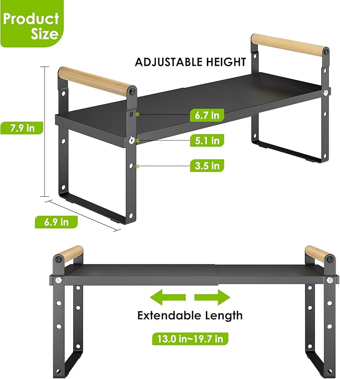 - 【Expandable & Stackable Cabinet Organizer】The length and height of this shelf can be adjusted, The length of expandable shelf can be adjusted from 12.87 to 21.04 Inches according to the different space; The Height can be adjusted from 5.3 inches to 7.68 Inches depending on how you want to arrange your space.