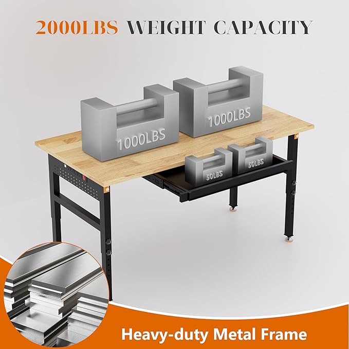 - Solid Wood & Reinforcing Rod: 60" x 24" solid rubber wood top with a sturdy metal frame. The weight load capacity of this heavy-duty workbench exceeds 2000 lbs. An extra support rod enhances horizontal stability, ensuring long-lasting performance.