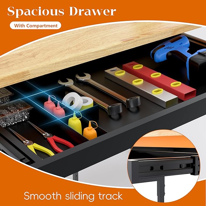 - Heavy Duty Workbench with Drawer: Features a 2" deep drawer with high-quality smooth slides supporting up to 100 lbs. Spacious enough for screwdrivers, wrenches, and small power tools. Includes a removable iron compartment, placeable on the left or right side for flexible storage.