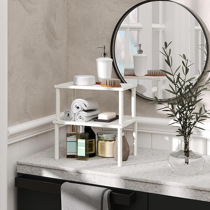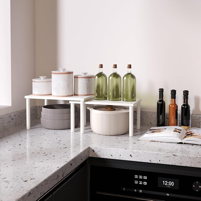 Cabinet Organizer Shelf(Set of 2),Kitchen Counter Shelves,Bamboo Spice Rack Countertop and Cabinet,Stackable Expandable,Medium,(White)