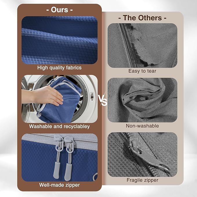 - Long-Lasting Materials:Unlike the cloth bags and compression bags you find on the market, DIMJ comforter storage bag are made from upgraded nylon material. They're tear-resistant, washable, odor-free, and have light water-resistant properties. These space saver bags are perfect for keeping your winter blankets, down comforters, king and queen size quilts, sweaters, sheets, baby items, and more dust-free and dry