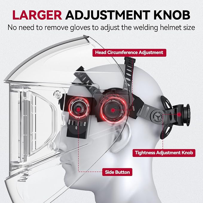 • EASIER ADJUSTMENT - The welder helmet features a newly upgraded knob section, allowing for easy adjustment even while wearing gloves. The interior of the helmet has been rearranged for a better fit to the human head, ensuring comfort even during extended wear.