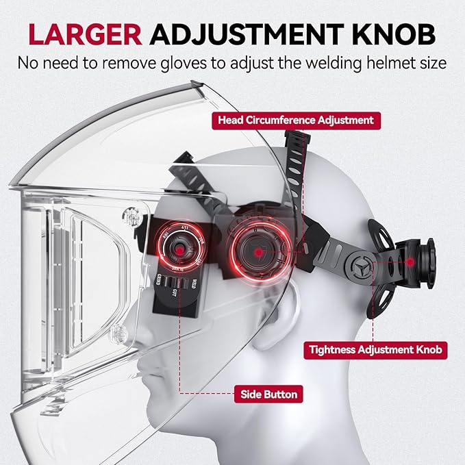 - EASIER ADJUSTMENT - The welder helmet features a newly upgraded knob section, allowing for easy adjustment even while wearing gloves. The interior of the helmet has been rearranged for a better fit to the human head, ensuring comfort even during extended wear.