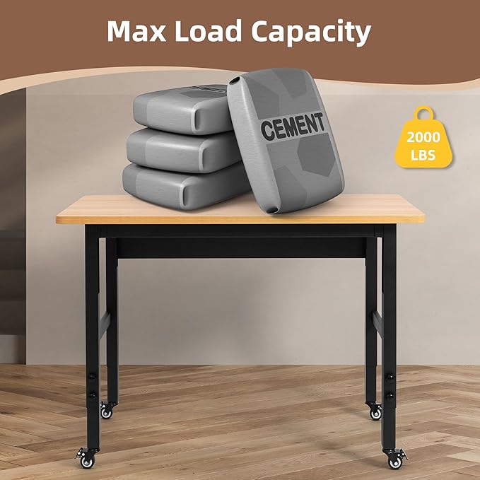 48" Adjustable Workbench with Wheels, Rolling Work Table for Garage, 2000 LBS Capacity Hardwood Work Bench, Heavy Duty Table for Workshop, Office, Garage, Home