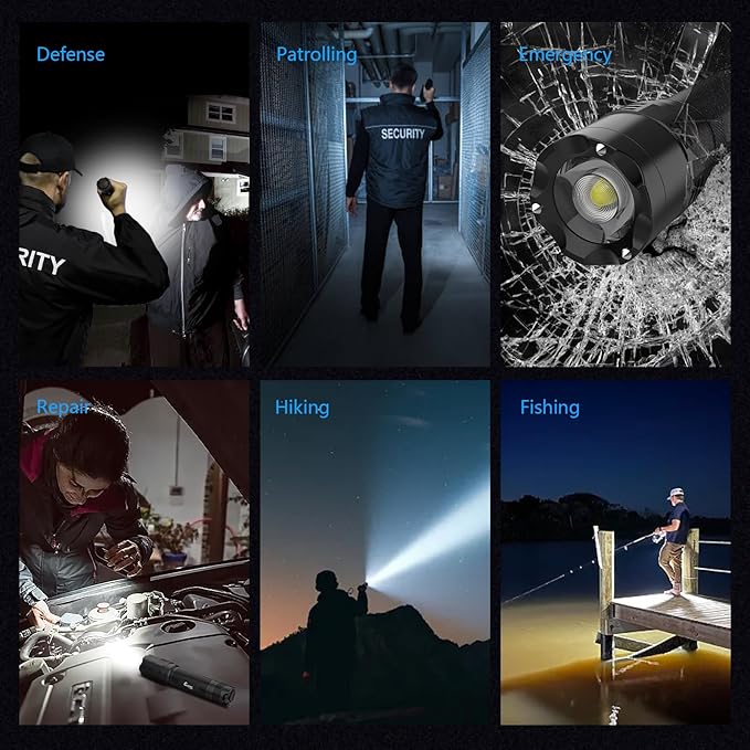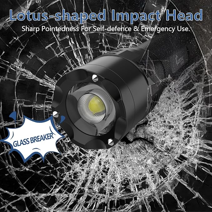 - MULTI-FUNCTIONAL APPLICATION - Stainless steel strike head inlaid with three tungsten steel beads is indestructible, and the flashlight's extra taper is designed for striking and instantly breaks windows, providing window-breaking functionality for superb tactical protection.Lotus-shaped striking head provides sharpness, whether it is used for self-defense, emergency law enforcement, tactical operations or personal defense can instantly respond to meet the daily lighting needs, highlighting the strong performance.