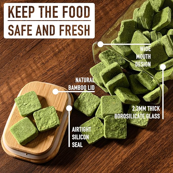 - [Safe Use] - Our glass storage containers are made of food-grade high borosilicate glass, which is not only lead-free and non-toxic, but also extremely durable, suitable for temperatures ranging from -4°F to 248°F. The lid is made of natural bamboo, not only enhancing practicality, but also blending well with various kitchen styles.