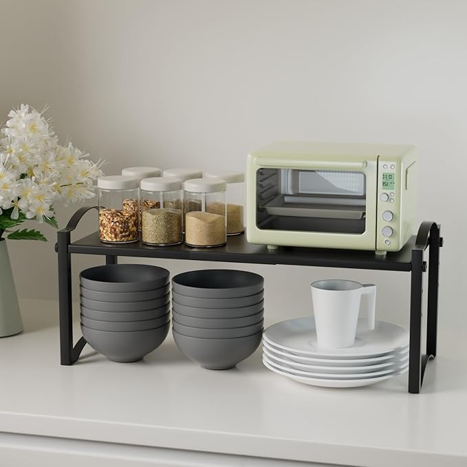 - 【Adjustable & Expandable & Stackable】– This 2-pack kitchen counter shelf measures (13"-22")L x 8"W x 8"H. Extend the length from 13" to 22" and adjust the height to 4", 5.6", or 7.2" for perfect organization of dishes, kitchen accessories, canned goods, and more. A versatile expandable shelf for cabinet and countertop use!