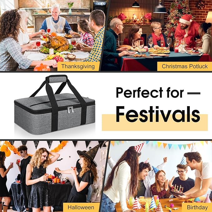 - Details: The casserole dish carrier bag adopt double zipper design, easy to open and close; The internal aluminum film not only holds heat but easy wiped clean with paper towels when encountering dirt; Note: Not machine washable