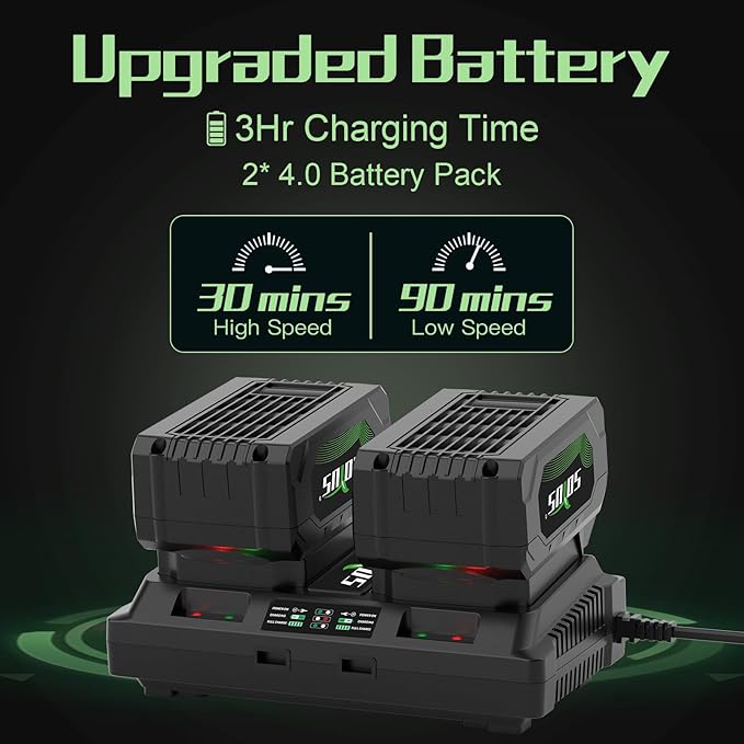 - 【2PCS 4.0AH Large Capacity Batteries】-The leaf blower cordless with battery and charger has a powerful battery capacity,which can support more than 30 minutes of cleaning at max speed,and a battery life of up to 90 minutes at low speed,and a full charge takes only 1.5 hours.The cordless leaf blower vacuum is designed with 4 speeds, you can clearly check the wind speed status and battery capacity through the control panel of the battery powered leaf blower.